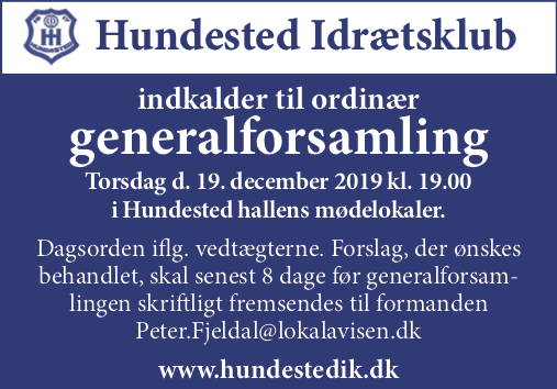 Der indkaldes til en årlige generalforsamling torsdag den 19/12 kl. 19.00 i Hundested Hallens mødelokale.